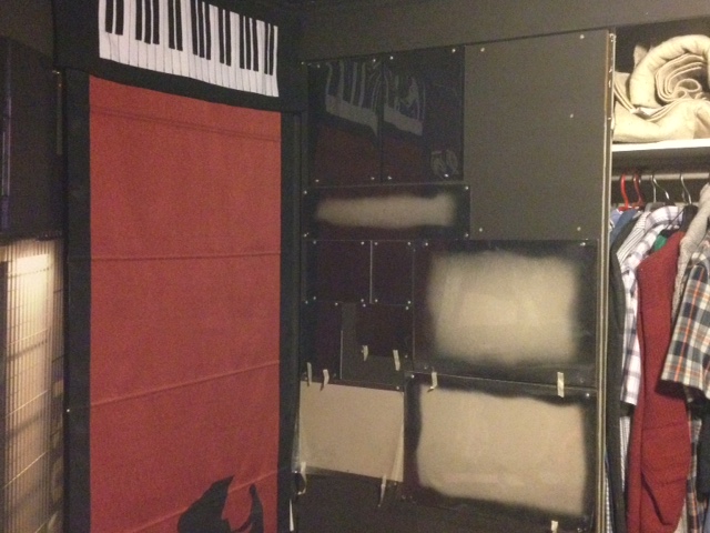 Luego, preferí tener mis elementos de música a la vista y ordenados, mas no guardados en cajas o bolsas. Estos elementos eran los que iba a usar para hacer música. Por lo tanto, invertí algún dinero en comprar en línea unos paneles ranurados los cuales instalé en el muro norte, al lado del diario mural, para que sea mi pañol. Este lo ocuparía para guardar mis elementos de música a la vista. Metrónomo, kazoo, micrófono, cables, uñetas, entre otros. Todo lo que podría servirme para hacer música lo colgué acá, una vez que instalé los paneles.