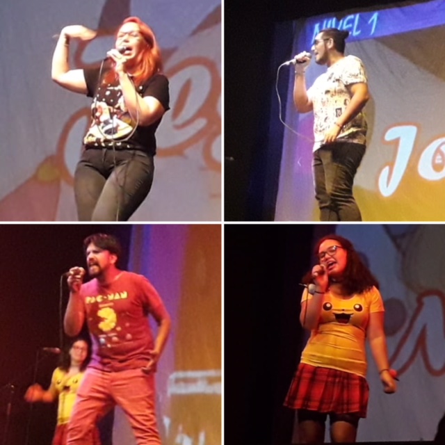 El primer grupal fue I’m Still Standing, original de Elton John, tema en el que nos alineamos sobre el escenario de manera alternada y donde cada uno fue haciendo un solo hasta el coro final, donde cantamos juntos. El público recompensó con aplausos y Lissette Chan (quien debió dividirse entre coordinar el escenario desde la cabina y animar el evento) le dió la bienvenida a la concurrencia.