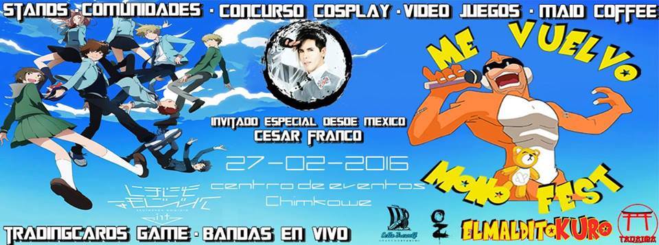 P.S. Como corolario de la historia, el evento “Me Vuelvo Mono Fest” se cambió de nombre a “Hanabi Fest”, aún producido por «Tadaima». Iba a ser en el gimnasio Chimkowe de Peñalolén -para 4.500 asistentes- pero por la deficiente venta de entradas se cambió al Ex-Teatro Mundo Mágico, entonces Casa de la Cultura de Lo Prado, para 200 espectadores. Luego, se sabría que por no pago de sus servicios no vendría César Franco, quitando quizá el único punto de interés del evento. Finalmente, una semana antes el evento fue cancelado. Y peor, hubo un escándalo con la no devolución de entradas por parte de la Productora, donde incluso se especulo con que un par de colaboradores amigos de la organización (un tatuador y un reportero geek) se «arrancó» con el dinero de los tiquetes.