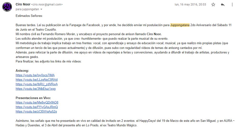 Para tal efecto, estrené un formato de correo electrónico donde saludaba al organizador, me presentaba, enumeraba algunos de mis eventos en los que canté e incluso aporté links como prueba de mi capacidad musical. Esperaba que se decantaran por una respuesta, al menos.