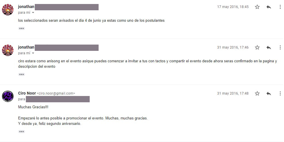 Me respondieron con prontitud. Al día siguiente, me informaron que para el evento los invitados serían avisados el 4 de junio. Un poco encima del evento, pensé. Sin embargo, no tuve que esperar esa fecha: el 31 de mayo me confirmaban como anisinger invitado. Me sentía contento, después de mis experiencias en HappyDays! y Aura. Sería mi tercer evento como artista por invitación. Y además, me solicitaban que iniciara con mis contactos el compartir el evento y invitarlos a mi vez a ellos. Mientras más gente acudiera, mejor para todos.