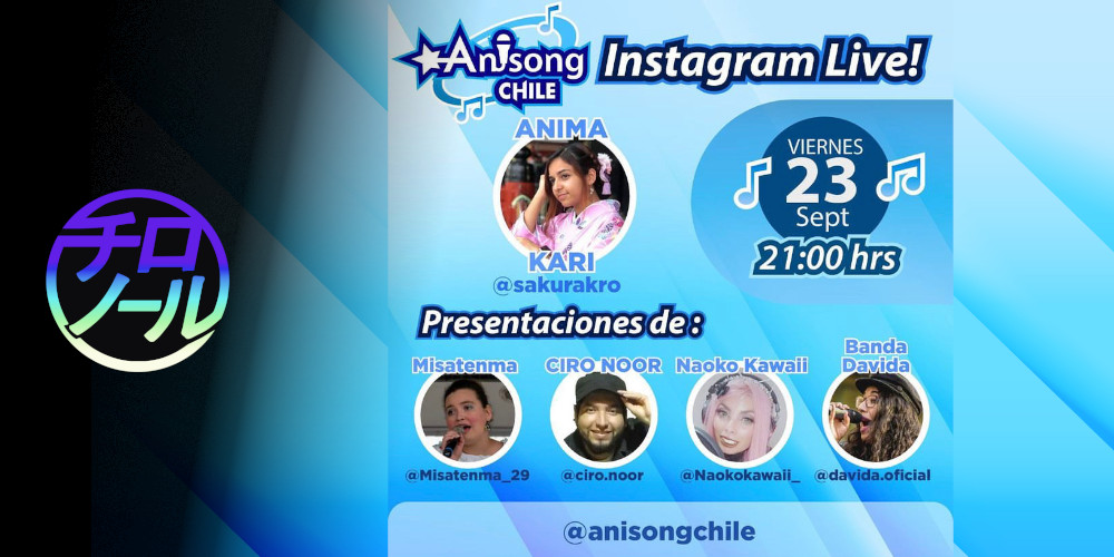 Este Viernes 23 de Septiembre de 2022 se celebró una nueva edición de Anisong Chile Live!, la segunda del año, una semana después de la primera. El objetivo era reencontrarnos con el público a través de la música en un espacio en Instagram. Como es habitual, la conductora fue Kari Cortés. Después de un ligero retraso, se inició con Misatenma. Luego vino mi turno. Más tarde cantarían Naoko Kawaii y Nana Ekkox con su banda Davida.