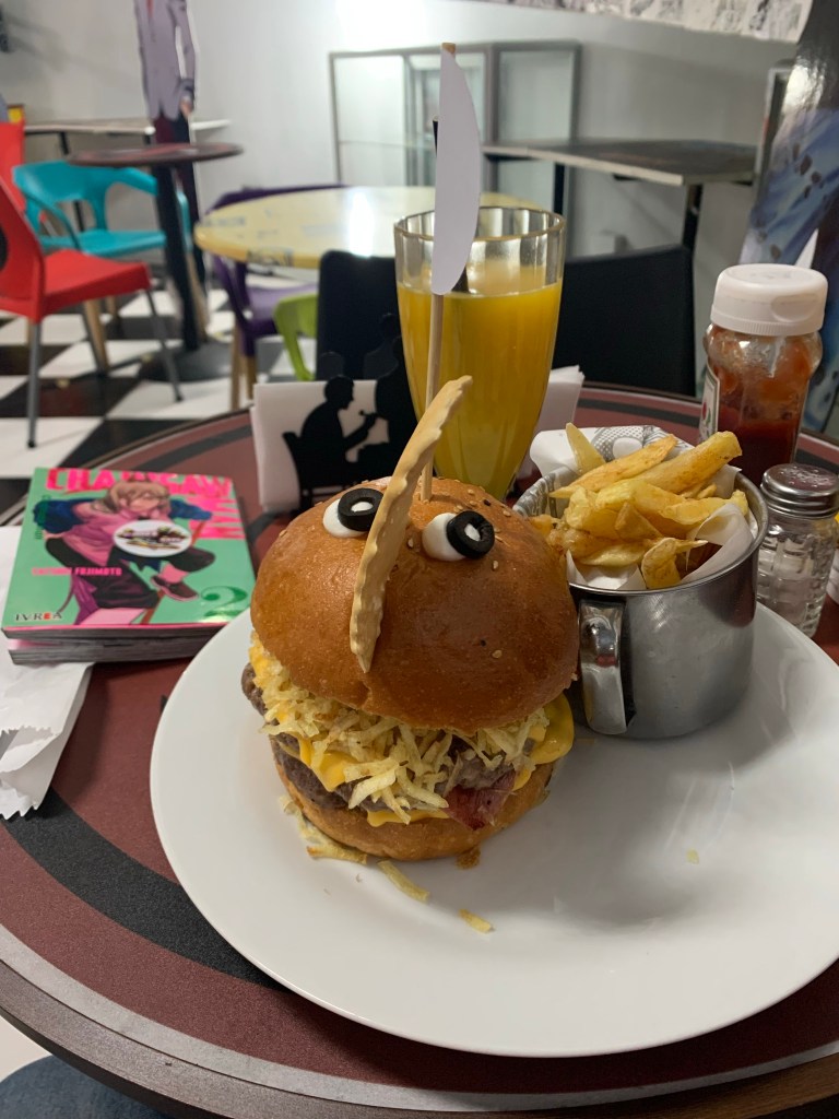 Me sentí cómodo en este lugar, sin duda fue una buena tarde. Quedé pochito con mi Pochita -no era una hamburguesa para nada pequeña- y disfruté la velada en un lugar que se identificaba con mis gustos de animé y geekeria. Espero volver algún día y probar algo más de su menú. La atención fue la adecuada, y no se demoraron ni con la toma de la comanda, ni con la entrega. Para mi es un lugar recomendable, quizá en algunos horarios pueda atocharse, así que mejor vaya con tiempo. Y como el tiempo es oro, puedes revisar el menú acá. Tienen opciones veganas y es un lugar iluminado y con presencia de media para distraerse. Este My Hero’s Café es un lugar para comer y disfrutar.