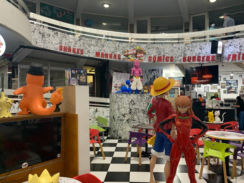 Para completar mi exploración, me di una vuelta con las estatuas de los animés que aparecían ahí. Les tomé fotografías. Había un togepi, un Monkey D. Luffy, una Asuka Langley, un Majin Boo y una 2D de Power, de Chainsaw Man. Le añadieron animé y colorido al café. Y tenían una variedad de manga bastante relevantes en el librero donde abundaba.