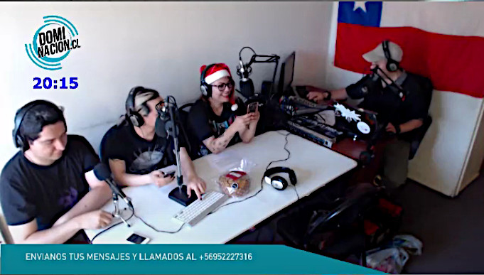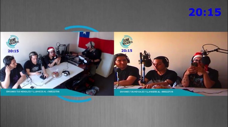 A la hora convenida, el auditorio se desocupó e ingresamos nosotros a sentarnos junto al mesón. A la cabecera esta Zukoe, el conductor. A su lado pero abriendo el costado estaba , Zelda. Luego venía Klaha y por último yo. Me colocaron un micrófono de trípode y luego de eso nos colocamos los audífonos y guardamos silencio. Detrás de Zukoe habia una bandera chilena. No recuerdo donde se ubicaba el hombre barbado. Estábamos saliendo al aire a las 20:15.