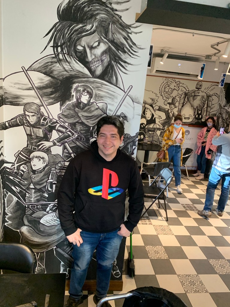 No hubo problema para entrar, pues ya habían permitido el ingreso por orden de llegada desde hace algún tiempo. Y me sentí aliviado de no tener que dar explicaciones respecto de ir solo, pues íbamos tres. Entré y volví a fijarme en los personajes que estaban en los muros. Eran muchos personajes de animé, y estaban presentes en todos los muros. La música que sonaba de ambiente también era de animé. Ya estábamos acomodados y el personal iniciaba la recopilación de nuestro pedido: José pidió un chocolate caliente, un Jolyne (jarabe de frambuesa con agua mineral, té chai y salsa de frambuesa) y más tarde un Aisuti (te helado). Nando pidió un rollito de canela con un chai latte con leche vegetal. Yo me incliné por un te negro más un cheesecake sin azúcar.