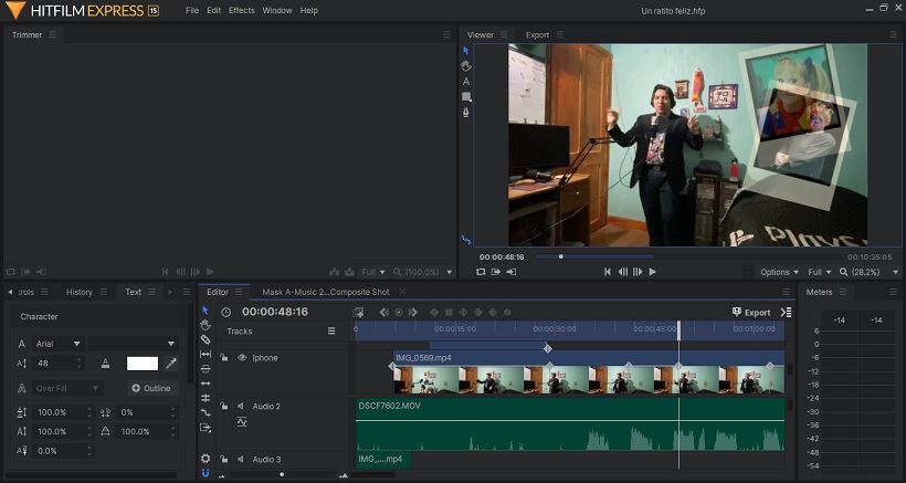 Las tres cámaras cumplieron su trabajo a la perfección. Una vez que acabé de grabar el audio de mi voz y el video con mis imágenes y movimientos, detuve todas las grabadoras, incluyendo el Reaper con el micro conectado. Guardé el archivo de sonido solo de mi voz y lo exporté en un mp3 luego de hacerle algunos retoques. Lo llevé a Audacity donde le subí la ganancia, lo limpié de ruidos y consolidé las partes que llevaban silencios. Acto seguido, guardé el audio depurado y lo reexporté a Reaper, donde lo mezclé con la pista de karaoke de manera definitiva. Sobre esa pista trabajaría en mi editor de video, que es Hitfilm Express.