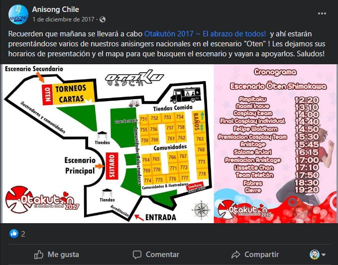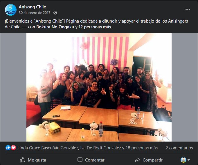 Durante unos días no tuve noticias. Luego, en un post en Facebook del 28 de enero de 2017, una fotografía se daba a conocer. Café Meido, en Santiago Centro. Era una donde se habían juntado muchos anisingers conocidos. En la foto reconocí a Salomé Anjarí, Jessica Toledo, Piyo asdf y Magda Fanplay. La cabeza de la foto era un nombre que me parecía atractivo: era una fanpage llamada Anisong Chile. La página se asignaba el objetivo de difundir el trabajo de los anisingers locales y potenciar su trabajo en la escena de eventos de animé. Me parecía un objetivo loable, y hasta cierto punto me contagié de su entusiasmo. No los conocía directamente, mas les desee suerte.