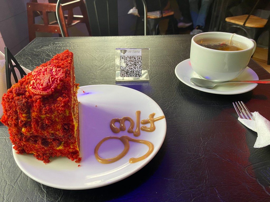 Tardó 5 minutos la garzona en llegar con mi pedido: una trozo de Torta Gry, que era de Red Velvet y una taza de Té Chai latte, con su respectivo trío de sobres de stevia. El plato estaba decorado con la numeración 9 3/4 escrita en manjar, numeración que corresponde al universo mágico de la saga. De manera amable se retiró y yo quedé en ese comedor con mis manjares.