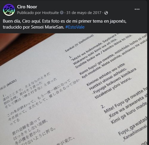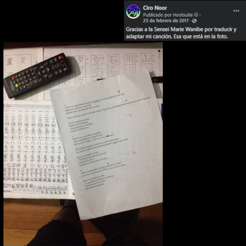 Además, me tradujo dos canciones de mi autoría al idioma japonés. Anteriormente, solo la sensei Reiko Nakai de Ceija me tradujo una canción (el proyecto Himno, inédito). Estaba buscando la posibilidad de cantar en japonés una canción inédita para la navidad y una ya escrita (Reencuentro). Esta última la tradujo como Saikai. De hecho, la grabé incluso y quedé contento con el resultado. Espero algún día estrenarla en vivo. Y ofrecerle a mi sensei Marie la posibilidad de escucharla. Y las siguientes.