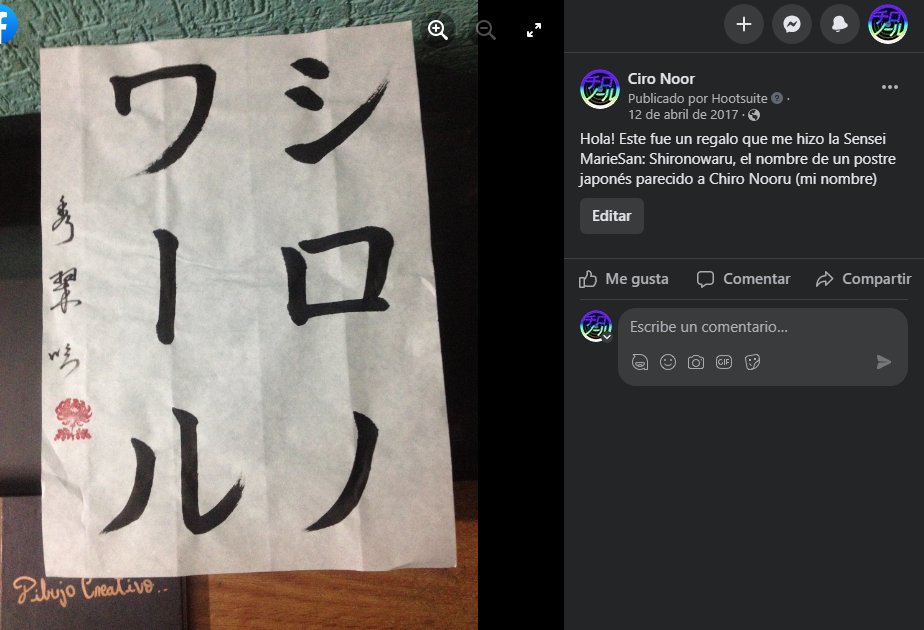 Unas clases más tarde, empezamos a trabajar en kanjis, su uso y significado. No conocía muchos, pero pensar en la cantidad que debiese memorizar me agobia un poco. Asi que acordamos ir aprendiéndolos a los ritmo. Y más aún, me ayudó con los kanji y me enseño caligrafía de shodo con tinta y papel de arroz. Mi maestra era una experta es estos avatares. Al tiempo, yo pude realizar mis propios kanjis en shodo, y más adelante, me compré en Ceija mis propias tinta, brocha y papel de arroz. Con ello comencé a practicar en mi casa el shodo que iba aprendiendo en clases. En una de esas, la sensei me regaló un shodo que decía Shiro No Wāru (シロノワール) y me explicó que era un postre japonés. Se trata de una pastelito circular con masa croissant servido con helado cremoso servido arriba y con agregado de miel de maple. No lo conocía, pero me dijo que era delicioso ¿Por qué ese postre? Por mi seudónimo: supo que me llamaba Ciro Noor y lo encontró parecido al postre. ¿Llegará el día en que se diga que mi música es dulce como un Shiro No Wāru?