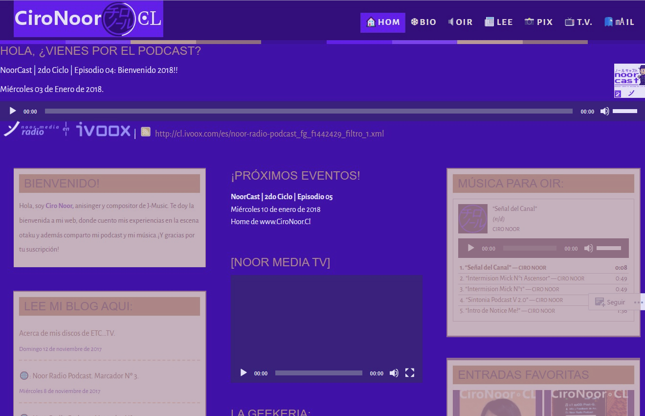 - En la inferior, coloqué empotrado en gadget de mi podcast directamente desde Ivoox, que era mi canal para el podcast. En la parte inferior, había tres columnas invisibles. A la izquierda, una tarjeta con un saludo de bienvenida, y abajo los títulos de las entradas más recientes vinculadas a su respectiva página de entrada. En la columna central, un indicador de mis próximos eventos o instancias especiales del proyecto, con fecha y hora. Debajo, una ventana de video con un metraje recomendado por mi, y bajo eso, links de interés como los de mis amigos arigatos. Por lo general, estos links titulados como «La Geekeria» eran a plataformas como Facebook, Twitter, Instagram y Youtube. Y en la columna derecha, una caja que contenía audios de mi música para oir. Abajo, un par de miniaturas con mis entradas favoritas. Y debajo, un buscador.