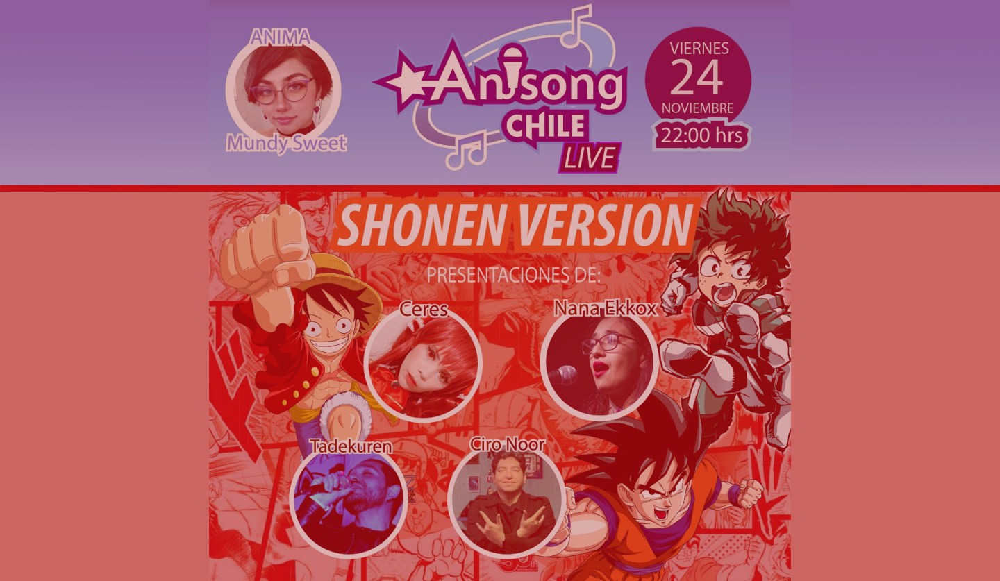 El evento virtual será conducido por Mundy Sweet y contará con las presentaciones de Ceres, Nana Ekkox, Tadekuren y un servidor. Será una jornada donde, a través de nuestros covers, homenajearemos al shonen y al público que lo sigue a través de sus historias y de su música.
