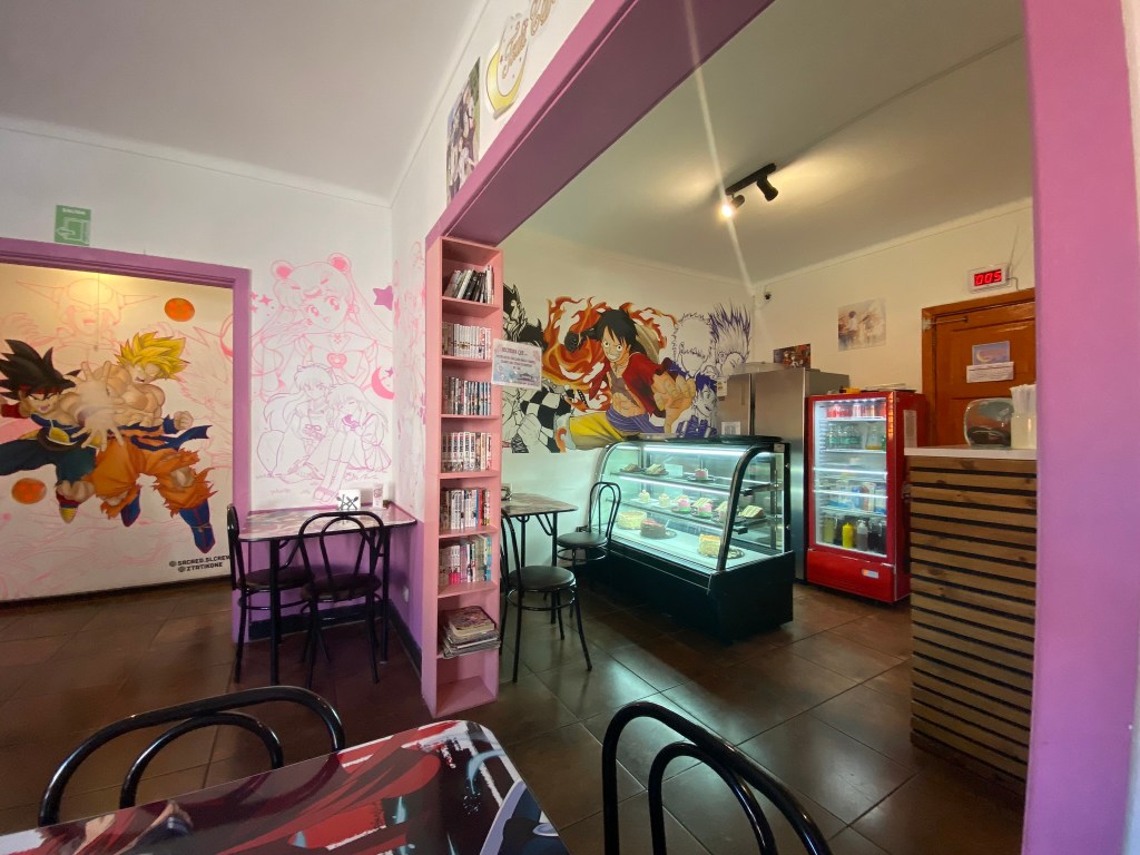 La decoración era animé, bastante pintoresca aunque la paleta de colores está más cargada hacia lo kawaii. Pero no usaron papel tapiz de animé, si no pintura original sobre los muros. Ese es un detalle que siempre se agradece en nombre de la originalidad y el estilo propio. Al final de pasillo está la puerta de la cocina, con su ventanilla de comandas, el baño de las mujeres y una vitrina con productos originales del café a la venta. De ahí venía una escalera que conducía al segundo piso, con más pasillo y otra sala decorada con motivos de animé, con sus mesas y sus sillas, y un baño para hombres (al que acudí y estaba impecable).
