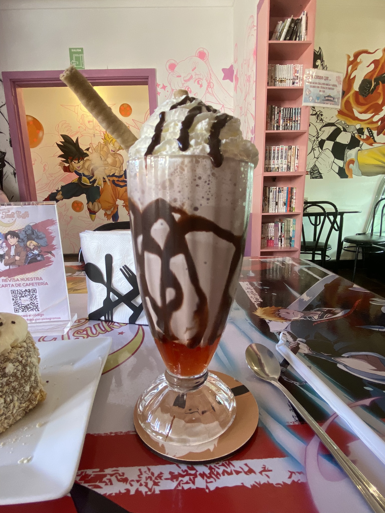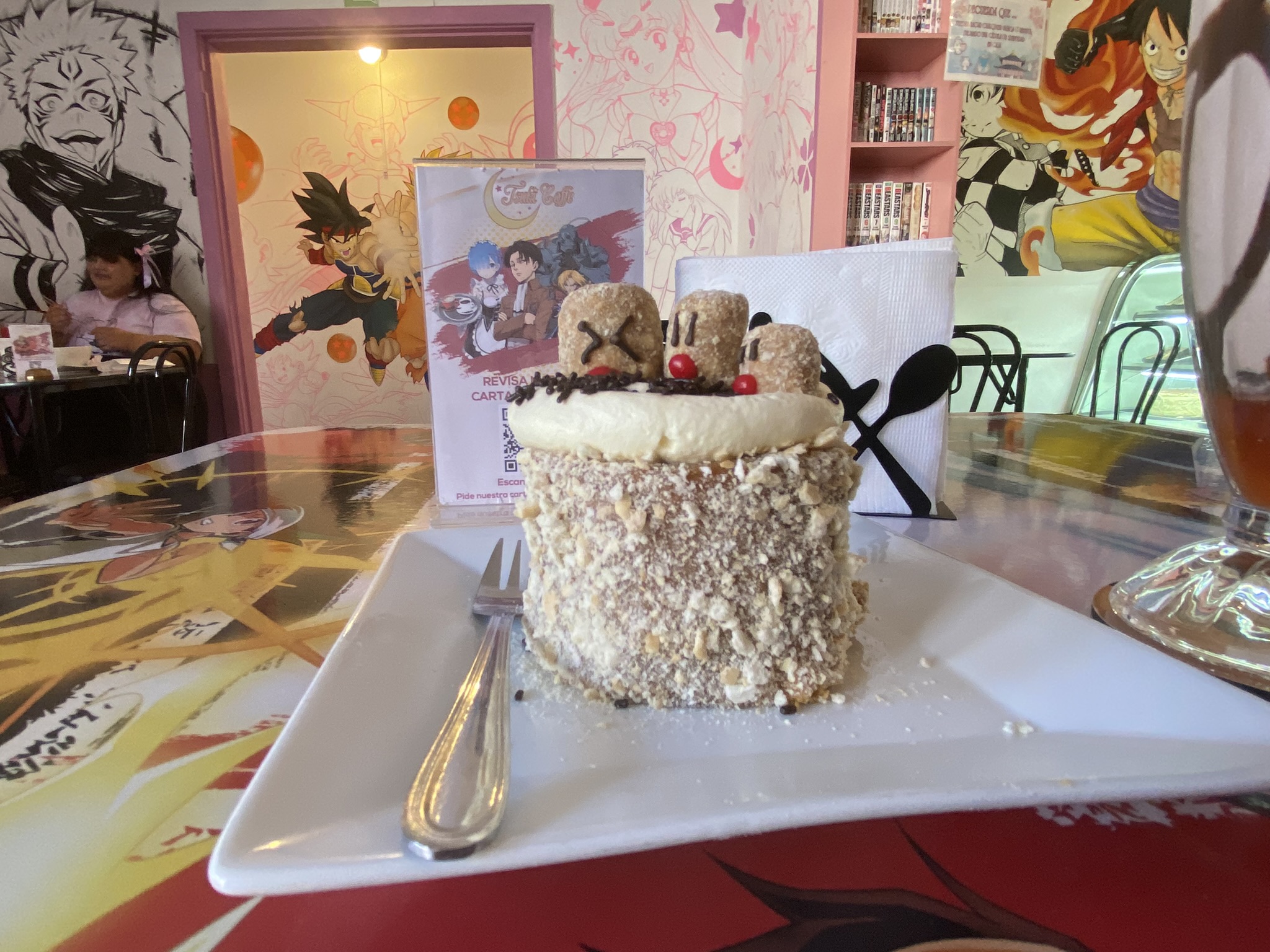 En la sala primera me recibió una garzona uniformada. Habían un par de mesas ocupadas por chicas jóvenes y una familia con niños. Amablemente me invitó a pasar, a tomar asiento y tocar el timbre de la mesa apenas me decidiera por algún producto del menú. El menú se veía a través de teléfono usando un código QR. Agradecí y empecé a revisar el menú mientras en el televisor y sistema de sonido del local sonaba un episodio de un animé que no logré identificar, solo categorizarlo como Shoujo.
