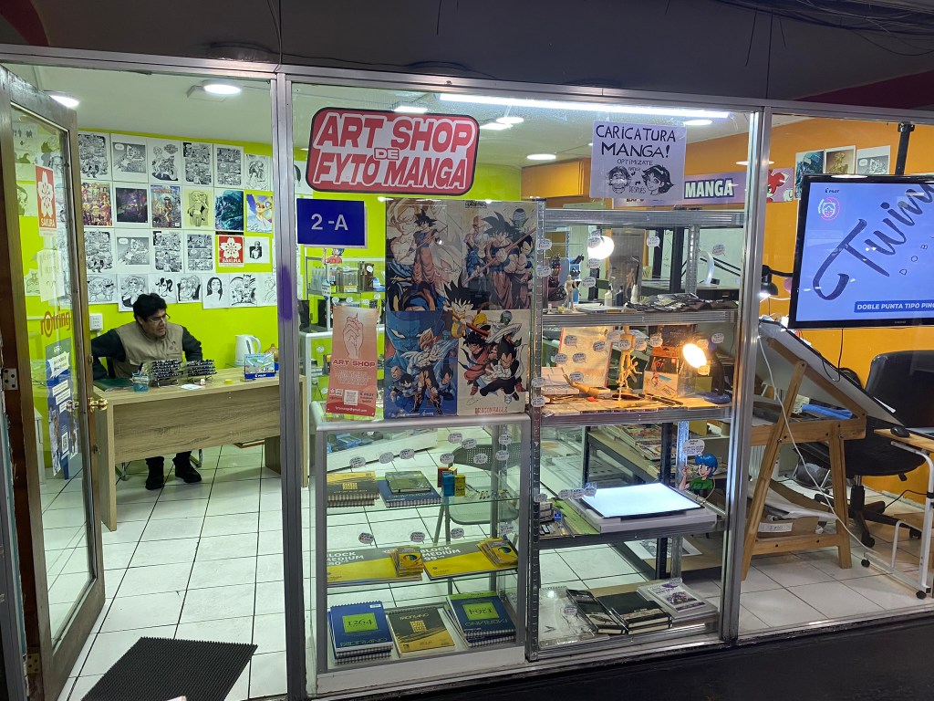 Mientras iba en bajada pensando si sería conveniente comprarme una empanada, aprecié algo que llamó mi atención: en el pasillo entre-caracoles más bajo está la reciente tienda del ilustrador Fyto Manga⁷, un referente de la cultura geek y otaku⁸ local. Alguien a quien escuchaba y conocía a nivel no personal⁹ desde sus apariciones en televisión y radio en diversos medios desde los años 90. Además, acudía a los eventos importantes del movimiento otaku y la cultura japonesa, colaborando en su difusión. Agrego también que fue colaborador frecuente en un par de revistas de comics en Chile.