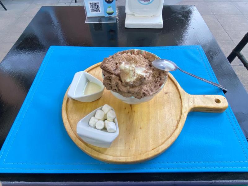En las mesas de la terraza disponen el menú en el teléfono del parroquiano (mediante código QR). Entre las delicias que ofrecen está el Chocolate Bingsu Individual. Un postre bien achocolatado, refrescante y dulce, sin llegar a hostigar. Se trata de nieve de chocolate, con helado de vainilla, crema de chocolate, ramas de chocolate, leche condensada y malvaviscos. Fascinante.