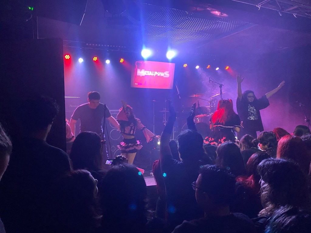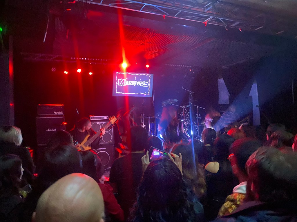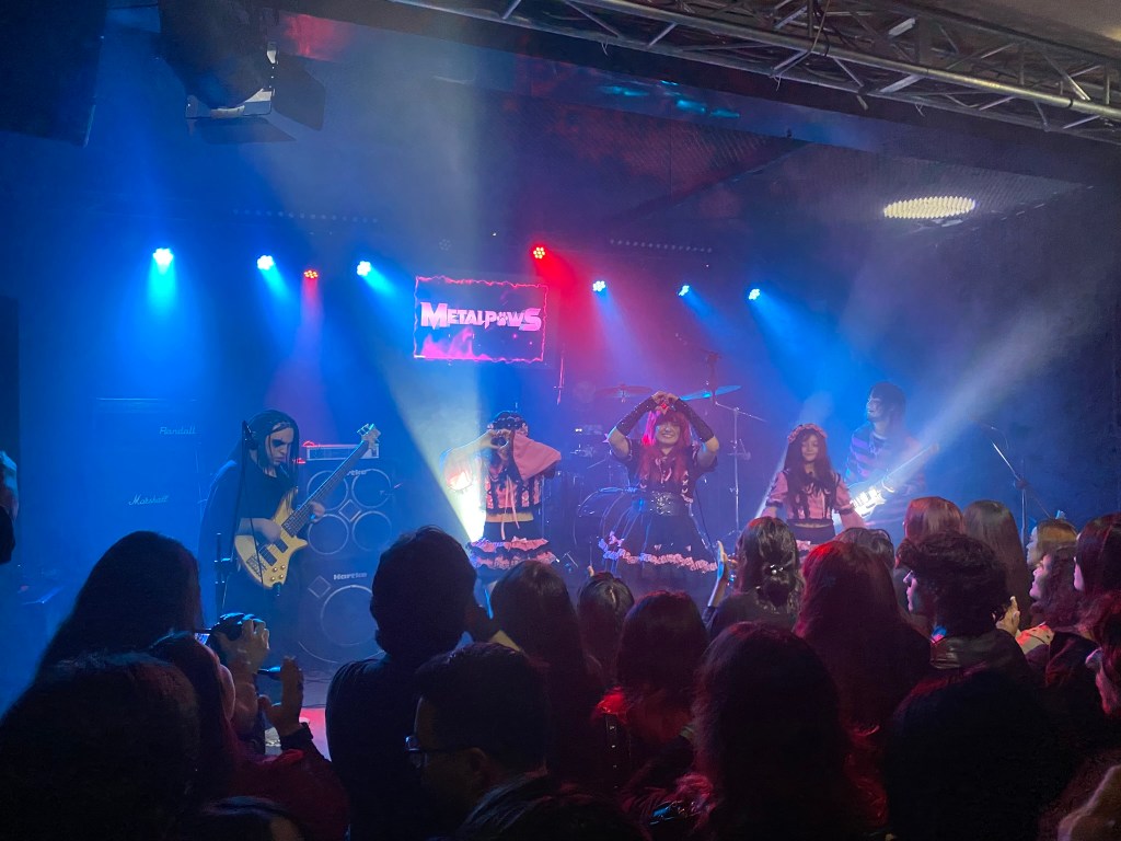 Y mientras yo estaba saliendo del baño, quien abrió el evento fue el locutor Rama de Radio Kauss, quien con su simpatía y entusiasmo habitual presentó a la primera banda: Metal Paws, las máximas exponentes del kawaii metal nacional, con el debut de sus dos nuevas bailarinas y coristas: Mimi y Peri. El concierto se inició con mucha energía y entrega. Yo había estado presente en la instancia anterior en que Metal Paws compartió con Victoriano en este mismo recinto y debo decir que esta ocasión estuvo mejor. La presencia de Metal Paws superó completamente mis expectativas respecto de la calidad del show y de la presencia escénica. Así mismo encuentro que el público también colaboró, hubo una actitud correcta de ir a ver un buen concierto con estas novelas representantes de la escena y por lo tanto el público se encendió sin gran dificultad por la calidad del espectáculo y por la potencia de la música. El público agradeció generosamente con sus aplausos la maravillosa presentación de nuestras guerreras kawaii.