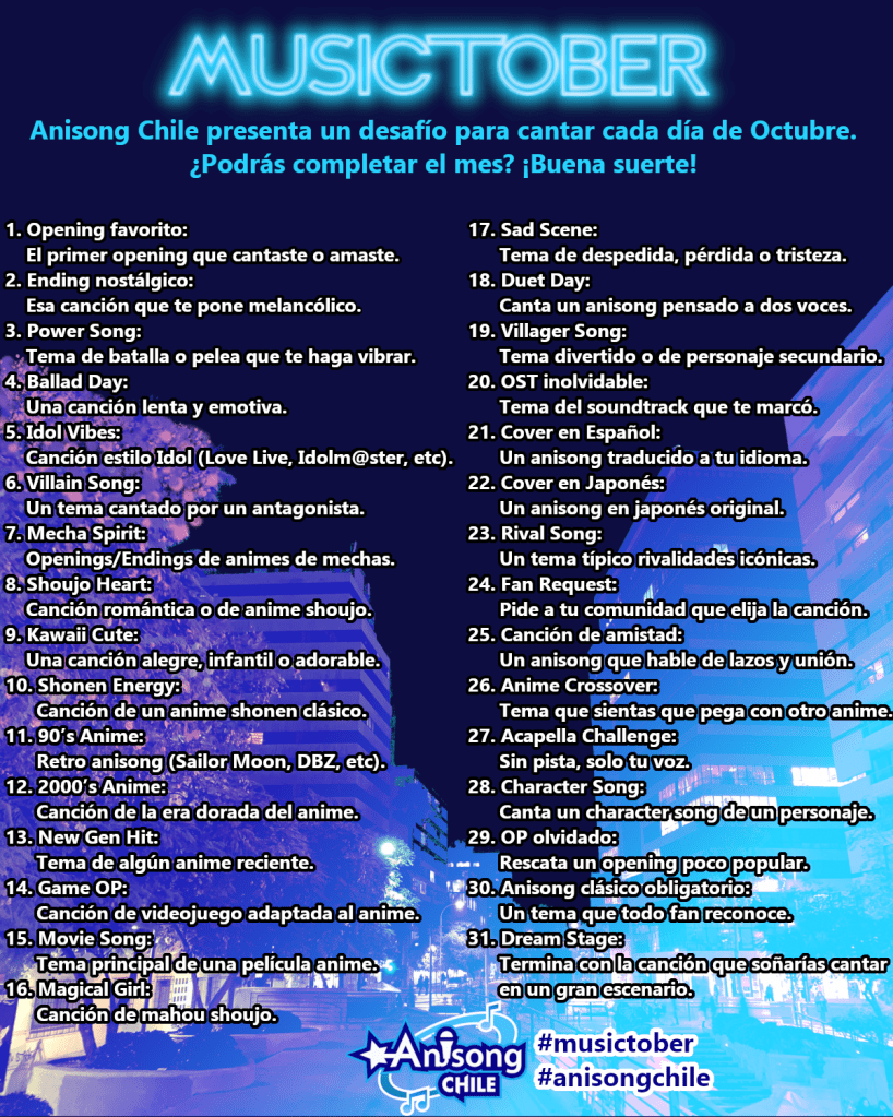 Este mes de octubre, a través del Instagram de nuestra comunidad @anisongchile , empezamos lo que es la difusión actualmente de la iniciativa musical para octubre, llamada Musictober 2025. En ella, los anisingers que pertenecemos a la comunidad, y por extensión, cualquier persona que lo desee, subimos videos, cantando distintos temas de anime, de acuerdo a los requerimientos dados en un listado para cada día del mes de octubre.